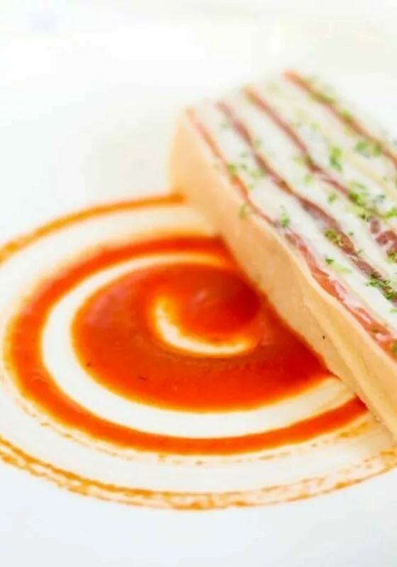 - Dispose a slice of mille-crepes, then plate the rolled vegetables tagliatelles.